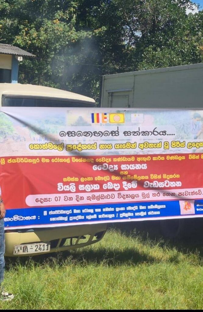 සමස්ත ලංකා බෞද්ධ මහා සම්මේලනය, ශ්රී ජයවර්ධනපුර මහ රෝහලේ විශේෂඥ වෛද්ය කණ්ඩායමක් සමඟ එකාබද්ධව කොත්මලේ ප්රාදේශීය ලේකම් කොට්ඨාශයේ කොත්මලේ කුඹල්ඔළුව සහ නියංගංදොර යන ගම්මාන දෙකට අදාළව ශ්රී ජයවර්ධනපුර මහ රෝහලේ විශේෂඥ වෛද්ය කණ්ඩායමක් විසින් වෛද්ය කඳවුරක් 2025.12.07 වන ඉරු දින උදෑසන 9.30ට කොත්මලේදී පවත්වනු ලබන අතර ශ්රී ජයවර්ධනපුර මහ රෝහලේ කාර්ය මණ්ඩලයේ අනුග්රහයෙන් එම ගම්මානයන් හී 500 දෙනෙකු සඳහා දිවා ආහාරය ද ලබා දීමට කටයුතු සංවිධානය කර ඇත.